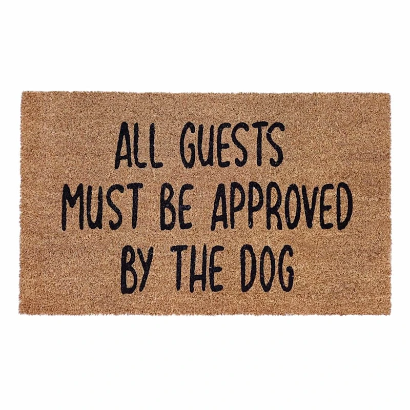 Our natural and black “All Guests Must Be Approved By The Dog” coir doormat lets you express your style as you welcome friends and family. With a wonderful natural hue, this 18x30in. doormat coordinates with all your seasonal decor.