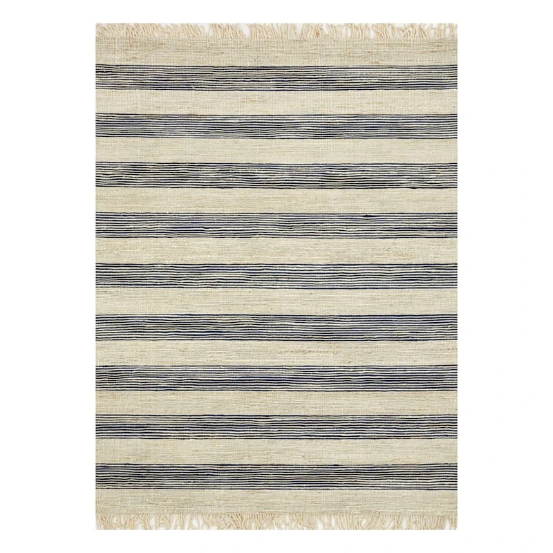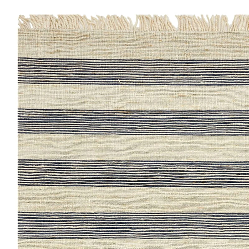 Modern farmhouse meets At Home prices in Honeybloom, our exclusive new brand that celebrates life lived together. All artistic aspects aside, area rugs help absorb and decrease the noise factor as they soften the step on hard flooring within your home. Our woven Honeybloom stripe jute fringe area rug is designed with a solid natural and neutral colorway paired with navy blue, bringing an element of organic simplicity to your space. Perfectly at home in casual to formal situations, this 100% jute rug is a natural go-to for eclectic living rooms, bedrooms and so much more. Available in 3x5ft., 5x7ft., and 8x10ft. sizes.