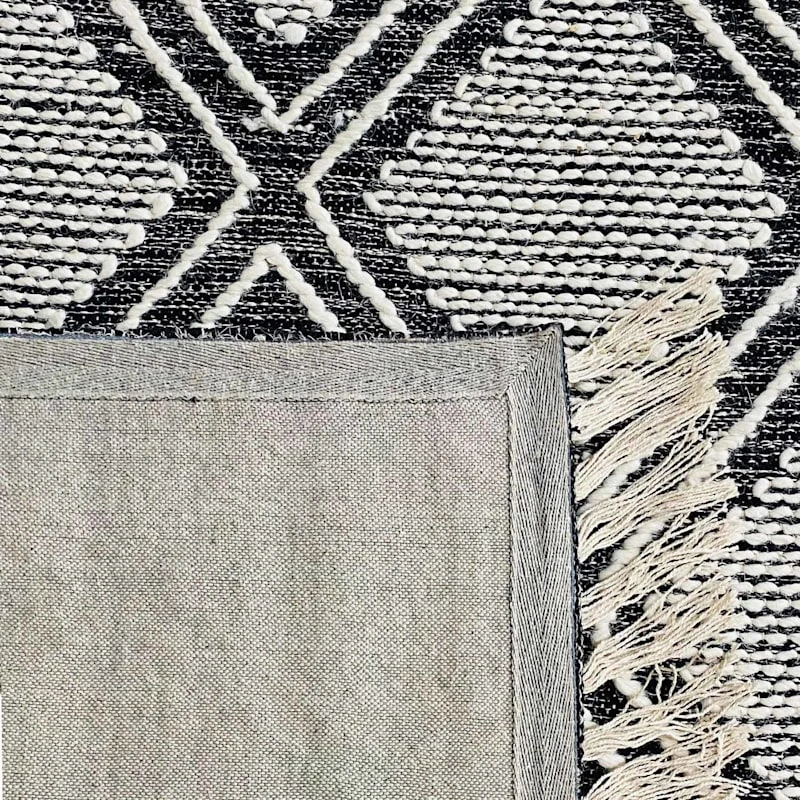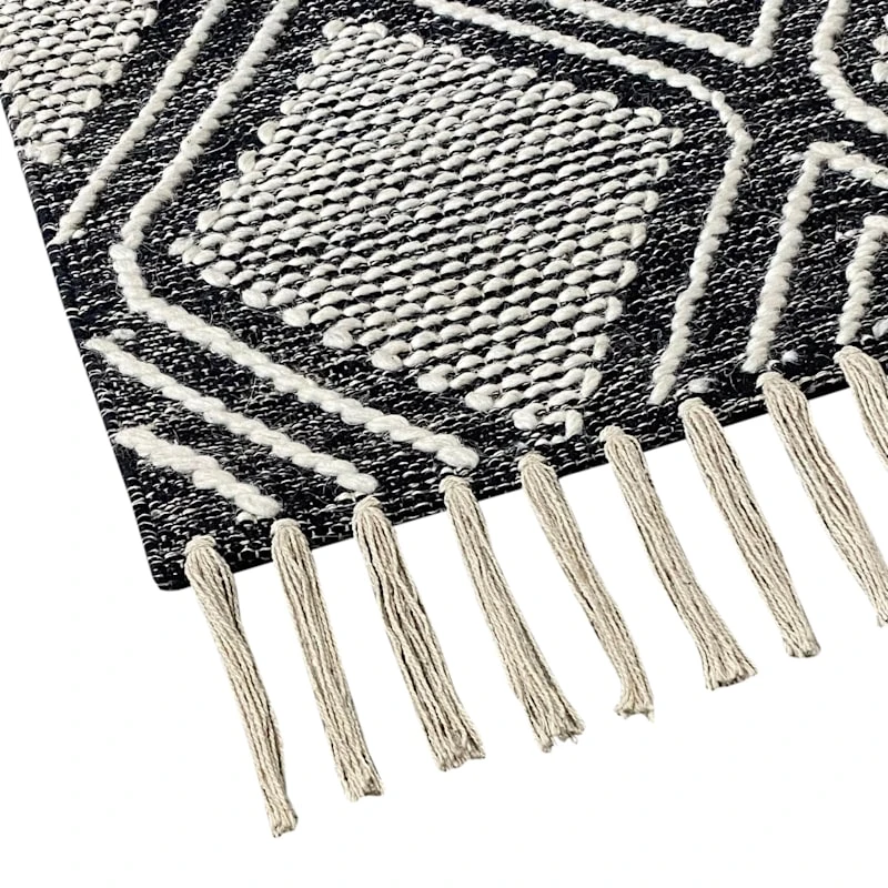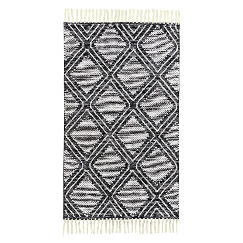 Found & Fable is a new collection that lets you explore what’s right around the corner. Choose your own adventure every day. Savor it all and say yes to what comes next—exclusively At Home. Ready to make its mark in the entryway or a statement under the kitchen table or coffee table, our Goa black diamond global-style cotton area rug is an ideal anchor for any adventurer’s living space. The linked diamond pattern in black and ivory adds to the overall personality of this versatile fringed rug. Available in 3x5ft., 5x7ft. and 7x10ft. sizes and a 2x6ft. runner.