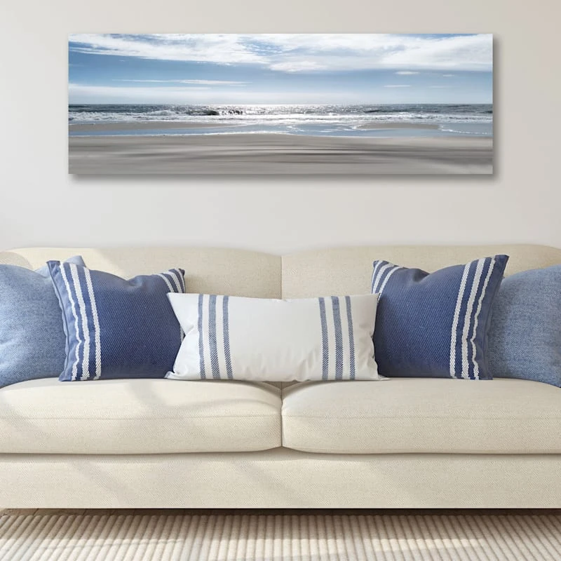 They say beauty is in the eye of the beholder. Art is too. Add a little character to any room in your home with our 36x12in. Beach Bliss canvas wall art. The possibilities are endless with this blue, grey and white wall decor. A multicolor peaceful beach motif creates visual interest against a visually interesting backdrop. Hang this wall decor to make a bold statement and to add a touch of personality to your home decor.