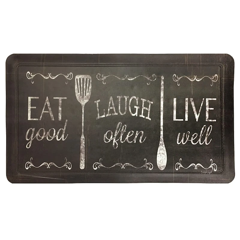 Give weary feet a rest in the kitchen with our GSTEP anti-fatigue black print mat with “Eat good, Laugh often, Live well” sentiment. The 18x30in. rectangular design is made of synthetic foam to offer extra cushioning underfoot. A non-slip backing helps keep it in place. Wipe clean with a damp sponge or cloth.