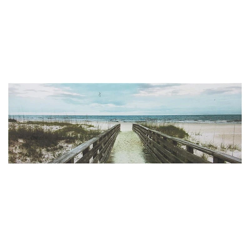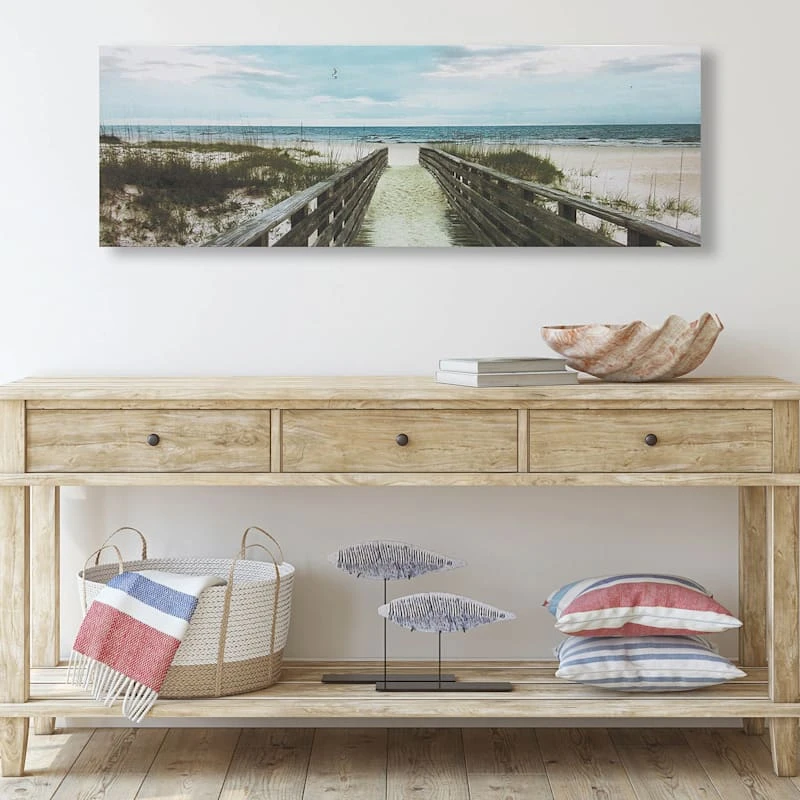 They say beauty is in the eye of the beholder. Art is too. Add a little character to any room in your home with our 36x12in. Happy Place canvas wall art. The possibilities are endless with this blue, ivory, natural, black and grey wall decor. A multicolor beach pathway motif creates visual interest against a visually interesting backdrop. Hang this wall decor to make a bold statement and to add a touch of personality to your home decor.