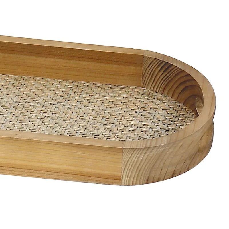 A collection that lets everyone relax in style. Polished finishes and classic hues pair with fun finds. Providence is where elegant settings still feel comfortable and warm—exclusively At Home. Freshen up your home with this 17x8in. oval wooden tray. Accented with a natural wood motif, this tray is on-trend to give your home that cozy farmhouse feels. Use to serve breakfast in bed, food, and drinks at a party or makes for an excellent centerpiece for your dining table, kitchen counter, coffee table, or ottoman.