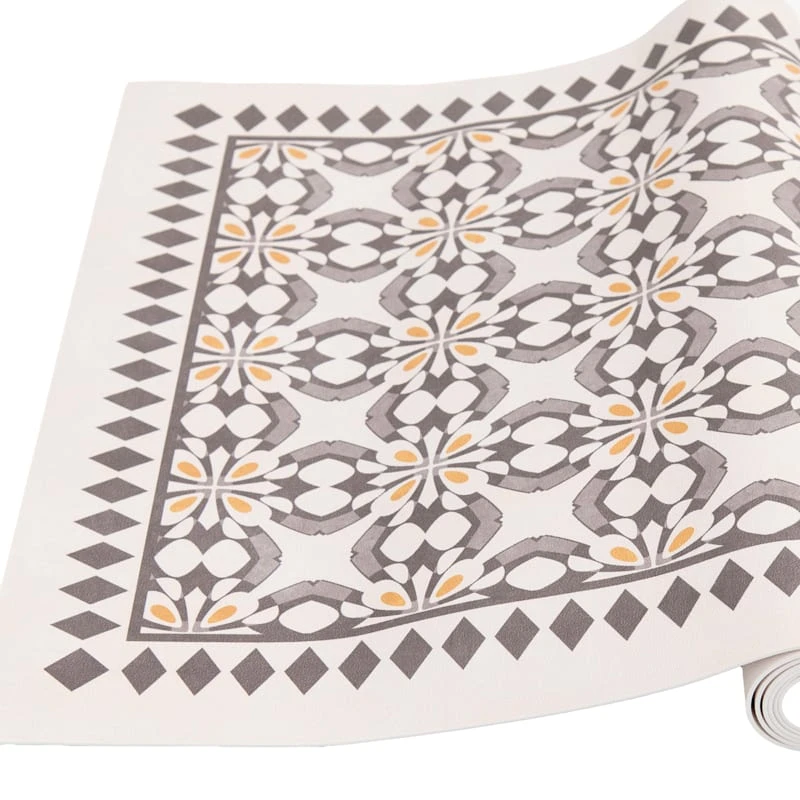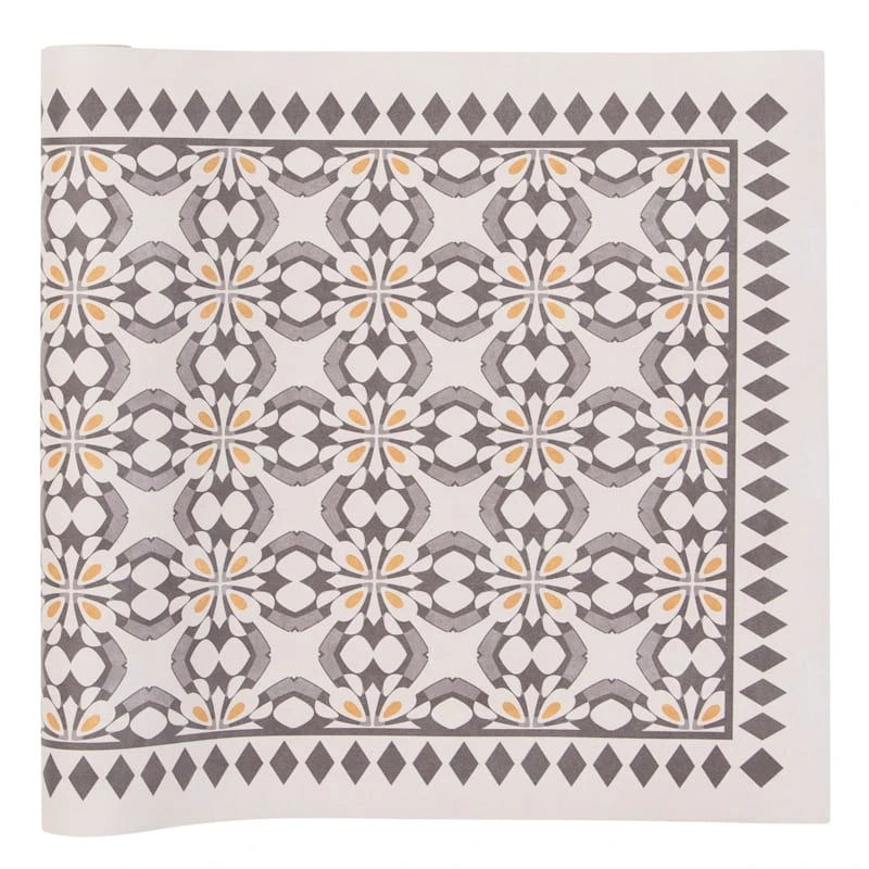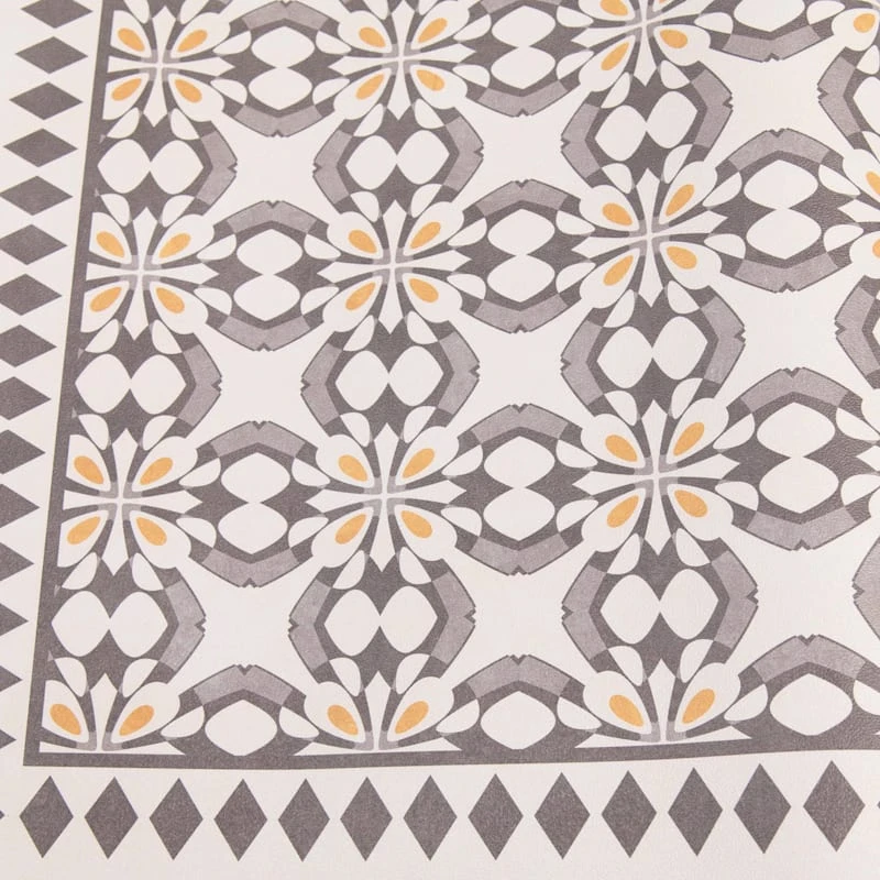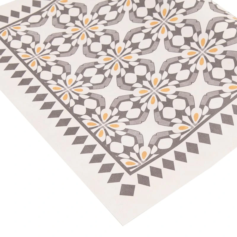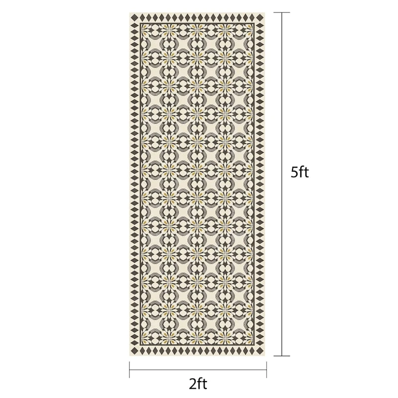 Our charming vinyl grey/beige 2x5ft. accent runner rug is ideal for updated and modern settings, and it helps with noise levels and keeps bare floors nice and comfy. The smooth vinyl and neutral grey and yellow medallion tile design offers a nice feeling decorative touch. This wonderful area rug will be comfortable in a contemporary loft or just at home in a modern farmhouse.