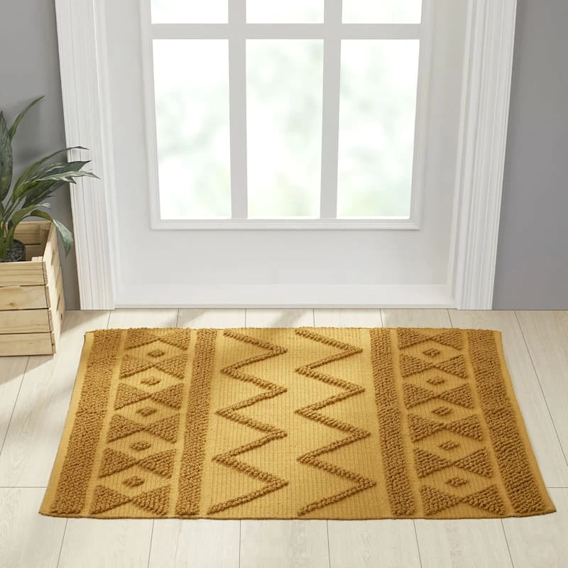 Our simple but striking 2x4ft. Reign scatter rug adds a textured foundation to your living room, bedroom or entryway. The solid yellow hue and global design blends in with a variety of color palettes and aesthetics. Plus, its synthetic construction is perfect for high-traffic areas, and in homes with little ones and furry friends.